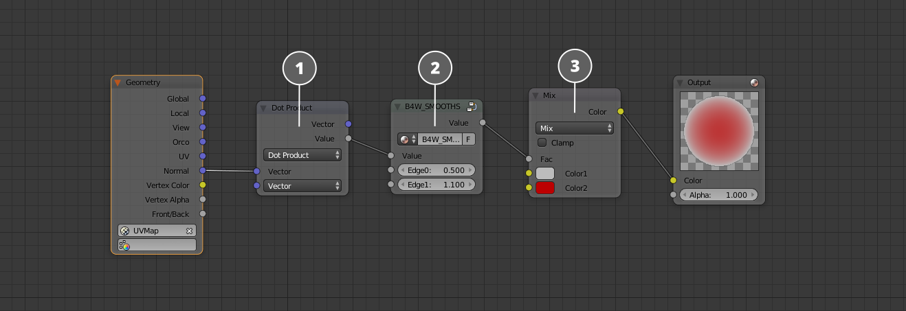 The Fresnel effect is based on the Dot Product (1) node with the value of the vector being [0,0,1]. The image is then compressed a bit (2) using a dedicated SmoothStep node. After this, a color is applied to the image.