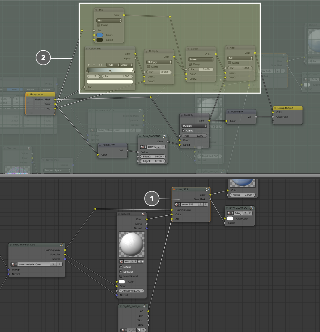 All the “magic” here happens inside of a dedicated node group (1). The shader basically combines the material with a baked Ambient Occlusion map and colors it with light shades. This way, SSS and light blue glow on the snow surface can be imitated.