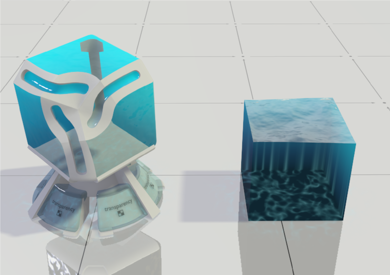 This brings us to one clever trick that will help us to add depth and caustic effect to any scene that includes water material. What we have to do is create a copy of a cube with normals flipped inside, so we can observe its inner surface. The shader itself is colored with a vertical gradient of colors ranging from deep to light blue. The material also includes two animated textures for caustics (1); they help to create an illusion of sun beams and flares at the bottom.