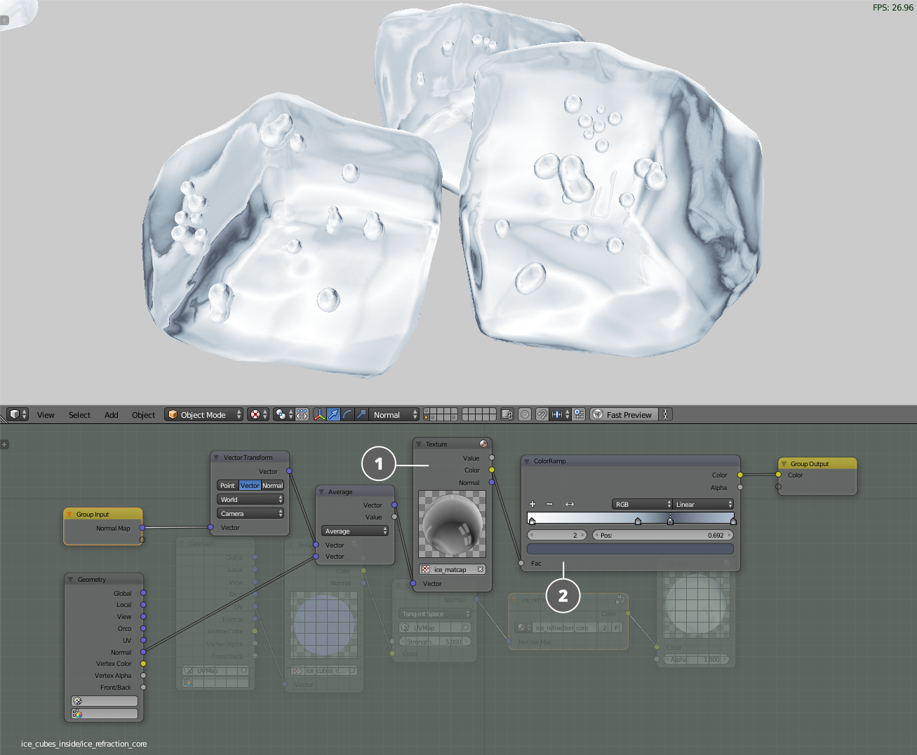 The image above shows objects with two “layers” of geometry. The material applied to the surface includes Refraction node, so it distorts the image of the inner part. Let’s take a look at the structure of the material.