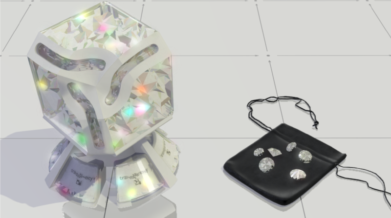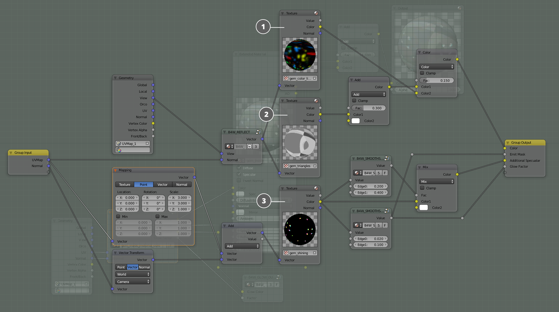 The structure of the material used for inner parts of a gemstone is similar to the one used for ice material. Its base is a black and white cubemap (2) colored using another cubemap (1) – this approach allows for producing a wide range of highlights. Dispersion effect is implemented using a texture with color spots, just as it is in the material for outer surface.
