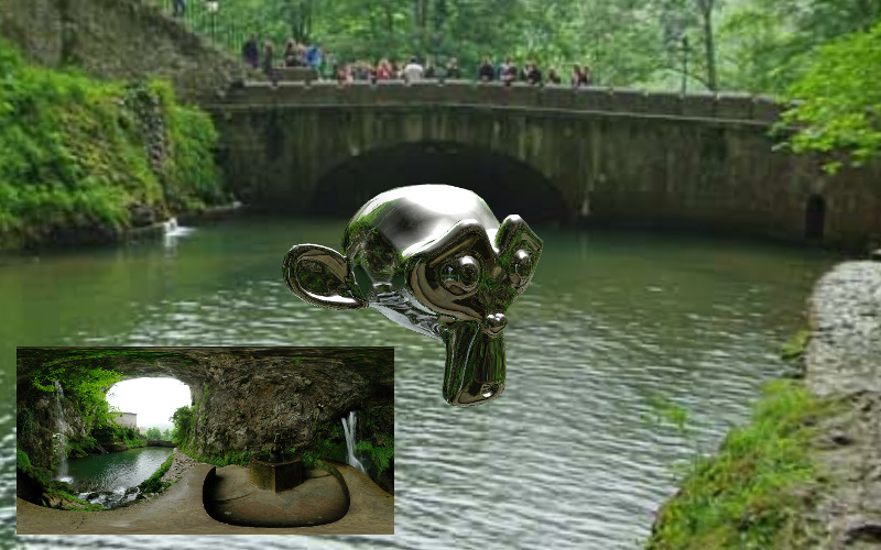 Для заднего плана используется равнопромежуточное изображение, поверхность модели покрыта простым материалом типа Glossy BSDF. Изображение взято с сайта texturify.com.