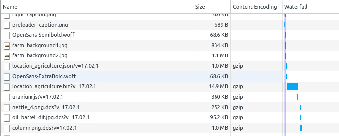 Эффективность компрессии хорошо заметна в нашем самом "тяжёлом" демо, в "Ферме": размер .json-файла уменьшился с 10.6 Мб до 693 Кб (т.е. в 15 раз!), а размер .bin-файла — с 37.9 Мб до 13.6 Мб (почти в три раза). Еще раз напоминаем, что с точки зрения достижения максимальной производительности gzip-компрессии всё же предпочтительнее конфигурировать сервер.