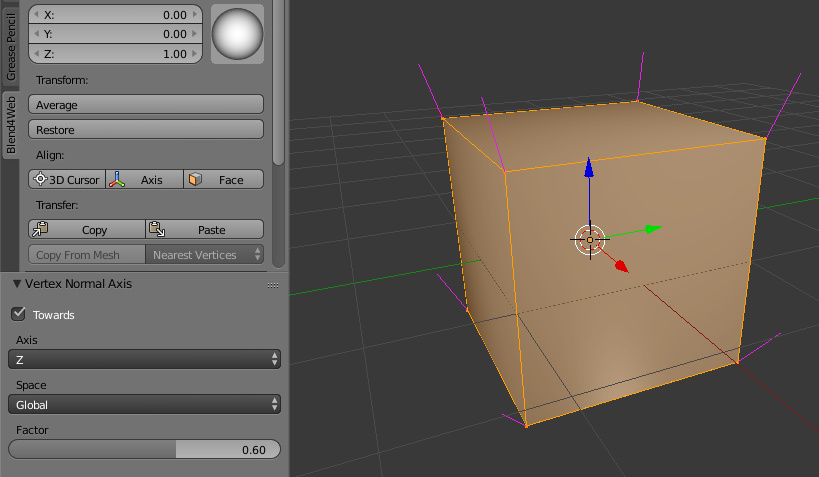 Как можно видеть на скриншоте, появилось несколько новых кнопок выравнивания, а некоторые старые были удалены. Эти изменения отражают изменения функциональности: старая кнопка Tree переименована в 3D Cursor, т. к. теперь она может выравнивать нормали как по направлению к курсору, так и от него. Кнопка Foliage могла поворачивать нормали только вверх; теперь она называется Axis и может работать с направлениями X, Y и Z. А для того, чтобы сделать работу с этими операторами более гибкой, добавлен параметр Factor и другие настройки.