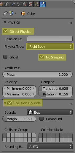На вкладке Physics необходимо включить галочку Object Physics и выставить Physics Type в Rigid Body. Установить галочку Collision Bounds с оставленным по-умолчанию значением Box для поля Bounds. Помимо этого, чтобы кубик не засыпал при низких значениях скоростей, необходимо включить опцию No Sleeping. Она позволит получить симуляцию падения нашей башни. |