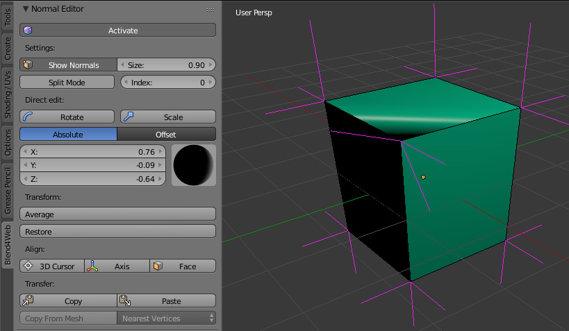 Благодаря отзывам пользователей Blend4Web редактор нормалей пополнился новыми функциями. Во-первых, теперь оператор Face можно применять к нескольким выбранным полигонам одновременно. Во-вторых, появилась новая кнопка Scale, предназначенная для масштабирования нормалей вдоль осей координат. Оси выбираются нажатием клавиши X, Y или Z на клавиатуре, масштаб же задаётся цифровыми клавишами (в частности, при нажатии 0 нормали выравниваются относительно плоскости).